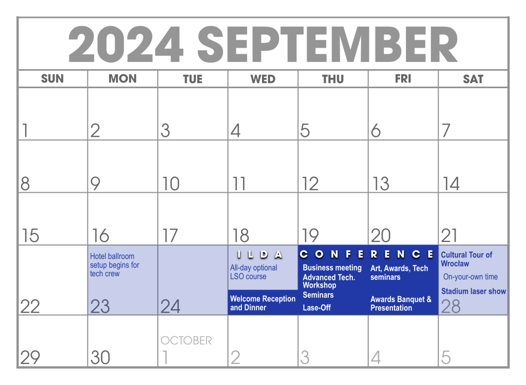 - Poniedziałek, 23 września: Hotelowa sala balowa dostępna dla gospodarza ILDA i ekipy technicznej w celu rozpoczęcia konfiguracji. Dostęp będzie kontynuowany przez resztę tygodnia. Powinno to pozwolić gospodarzowi i ekipie technicznej na wcześniejsze przygotowanie ORAZ udział w sesjach ILDA w dalszej części tygodnia.
